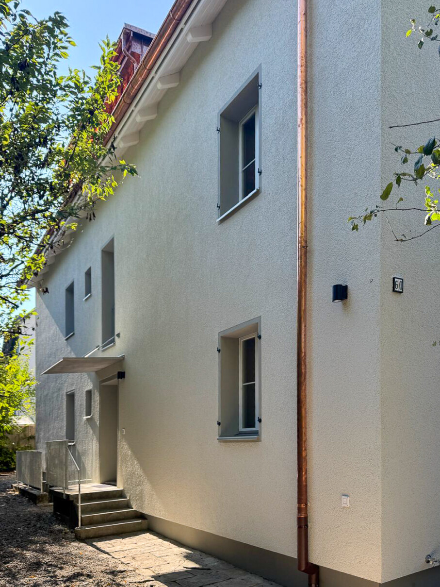 Das neue Regenfallrohr aus Kupfer führt das Wasser entlang der frisch sanierten Fassade ab.