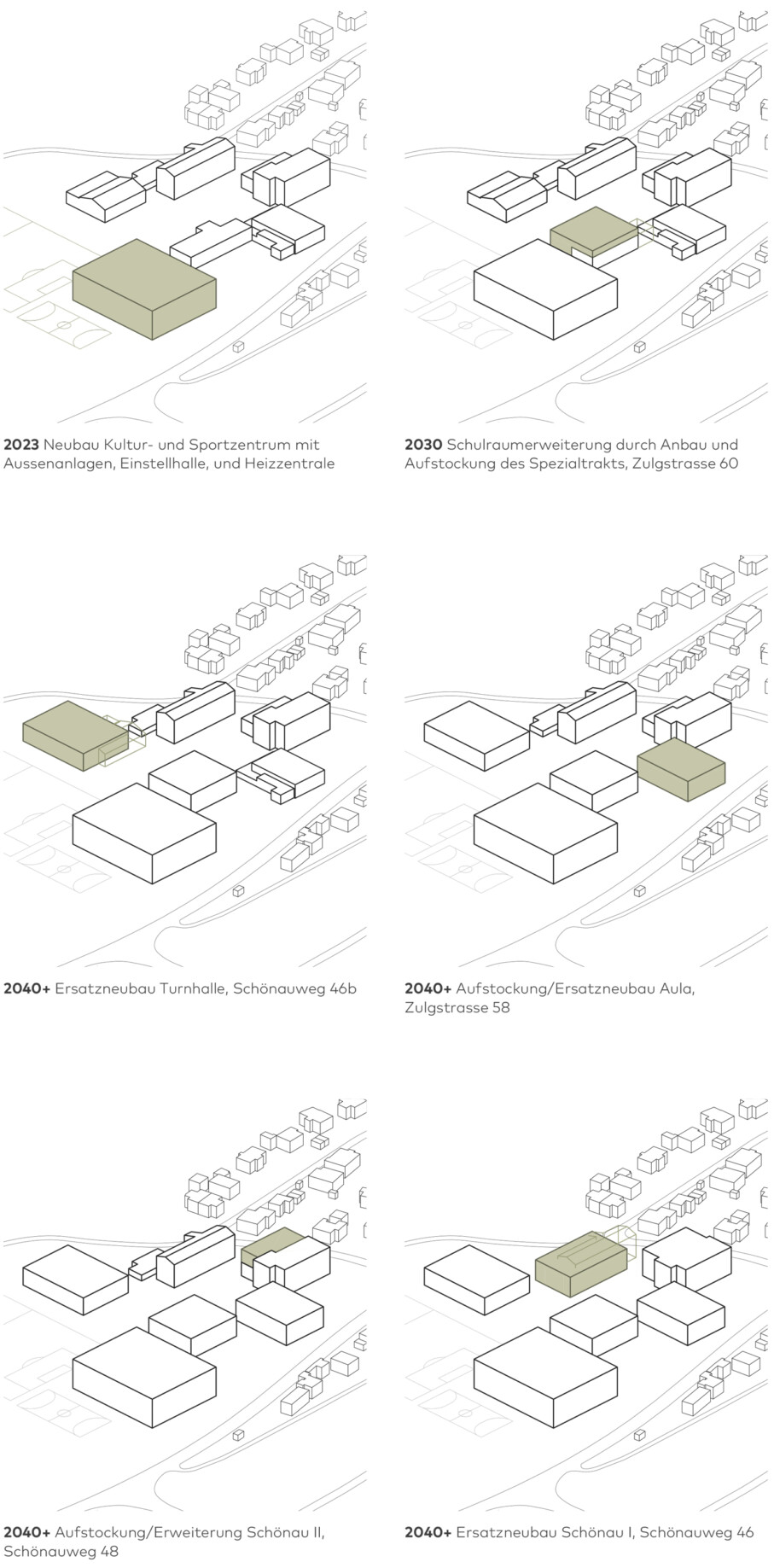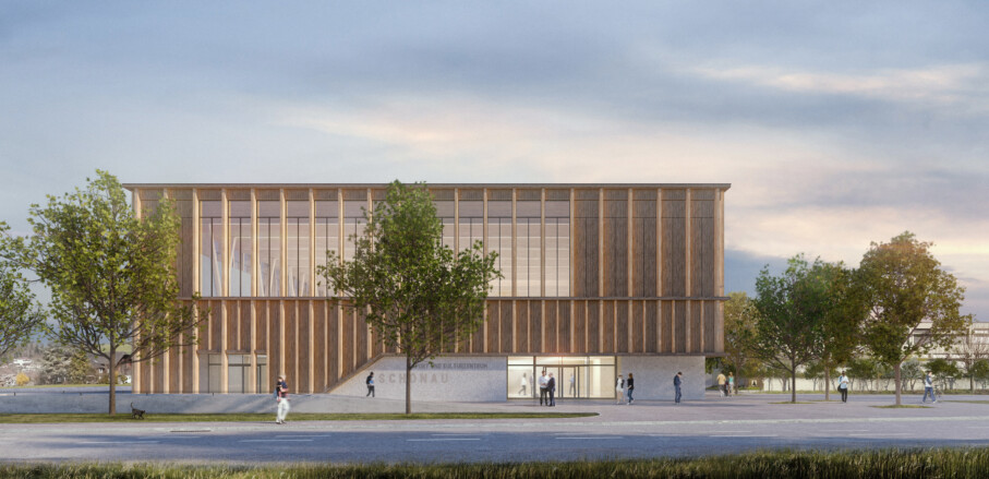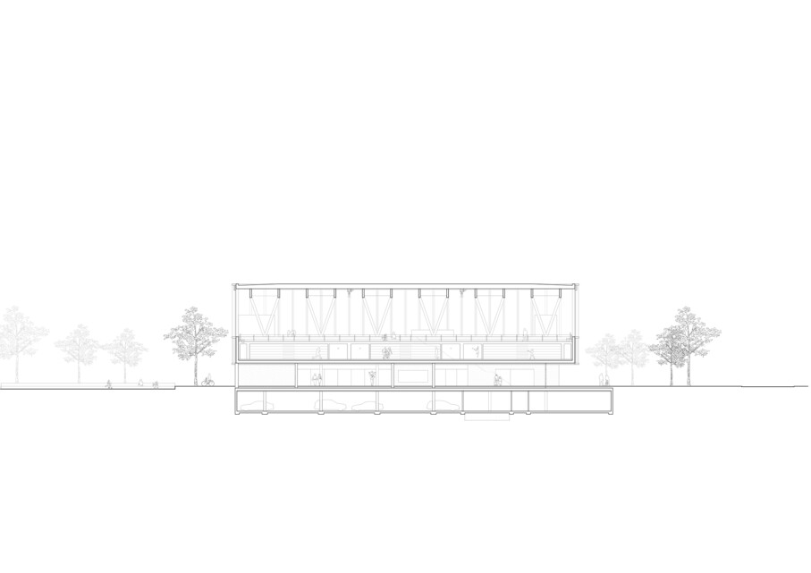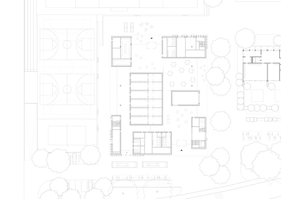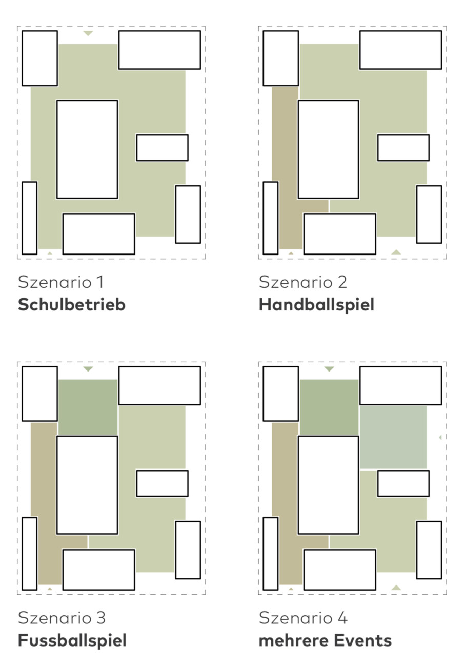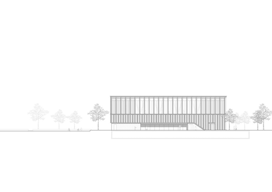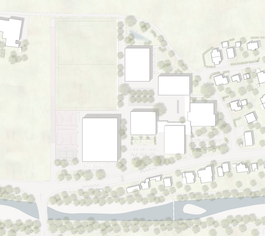 Die Sporthalle mit den Spielfeldern, Geräteraum und Zuschauergalerie kommt über dem Erdgeschoss zu liegen. Das konsequente Stapeln der Nutzungen reduziert den Fussabdruck und verleiht dem Gebäude eine repräsentative Erscheinung mit hohem Wiedererkennungswert. Die Materialisierung des Neubaus beschränkt sich auf warmtonigen Beton, Glas und Holz. Der präzise Einsatz der Materialien unterstreicht die einfache, klare Geometrie des Baukörpers. Diese Geste akzentuiert die Zugänge, begünstigt die Orientierung der Besucher und verortet den Neubau konsequent in seiner Umgebung.