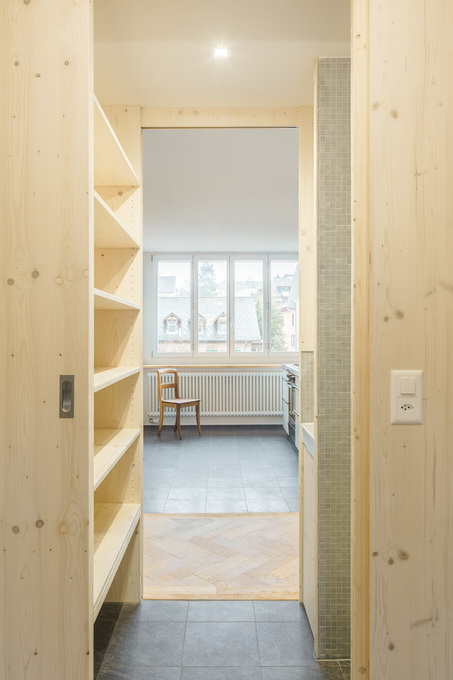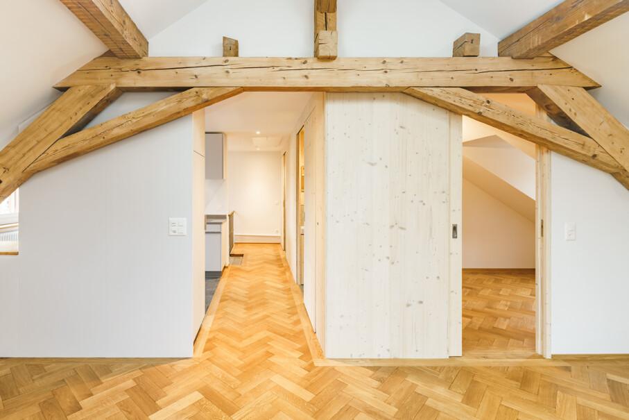 AussenMit dem Umbau trägt die Bauherrschaft ihren Teil auf dem Weg zur 2000-Watt-Gesellschaft bei: Das Dach wurde nachisoliert, die Wärmegewinnung erfolgt neu mittels Erdsonde und die Photovoltaikanlage auf dem Dach versorgt die Wärmepumpe mit erneuerbarer Energie. Mit dem gefassten Regenwasser werden WC-Spülungen und Waschmaschinen gespiesen.